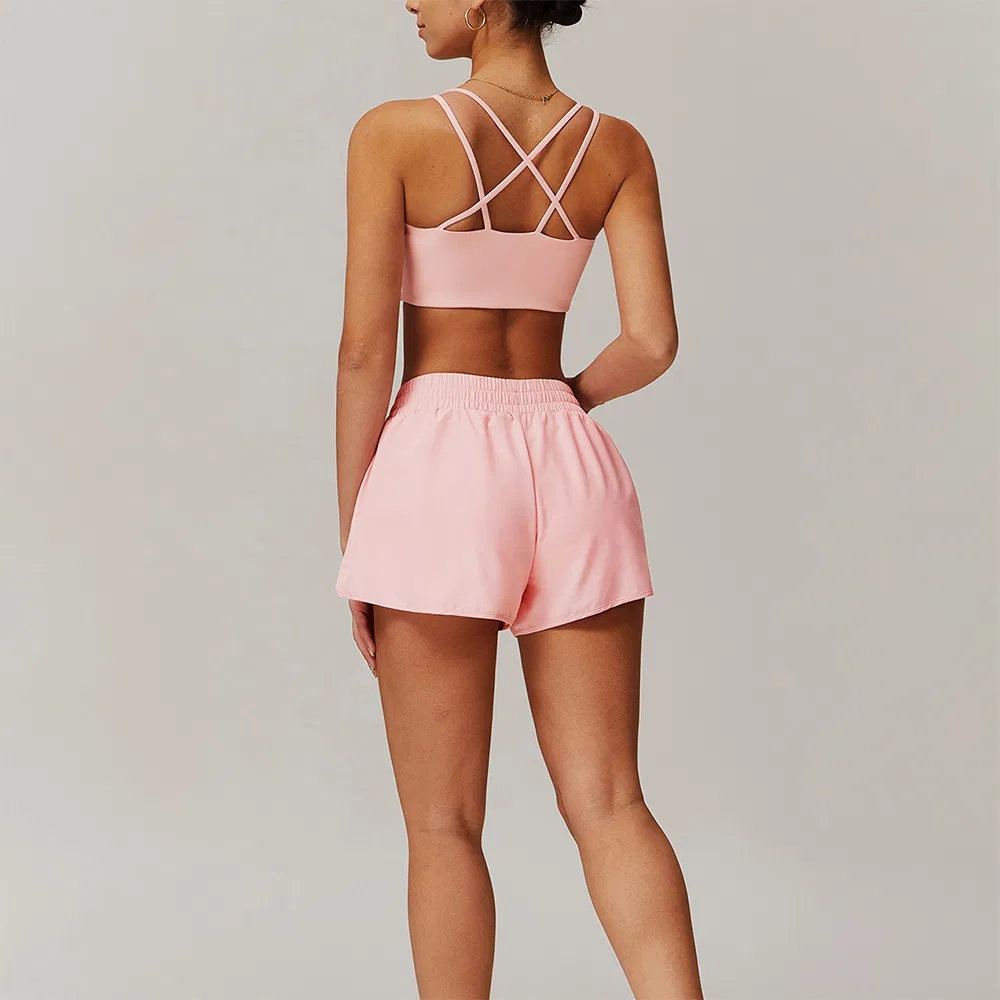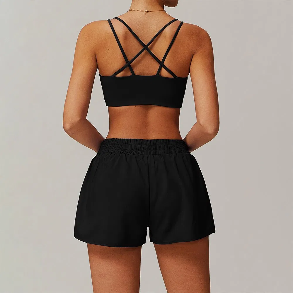 Quick-Dry Workout Cross Push up Sport Bra Hip-Lifting Running Cycling Fitness Fashion Shorts with Pockets 2 Pieces Gym Women Training Yoga Clothes