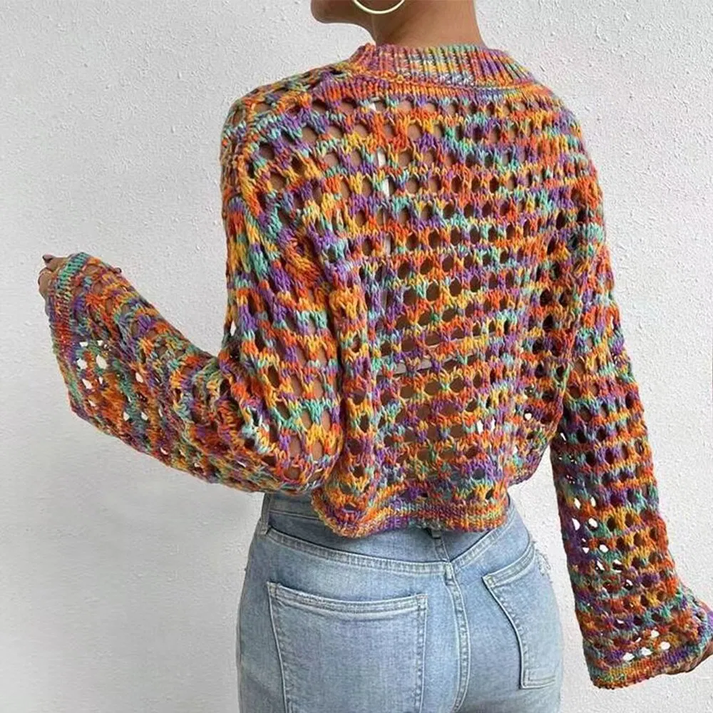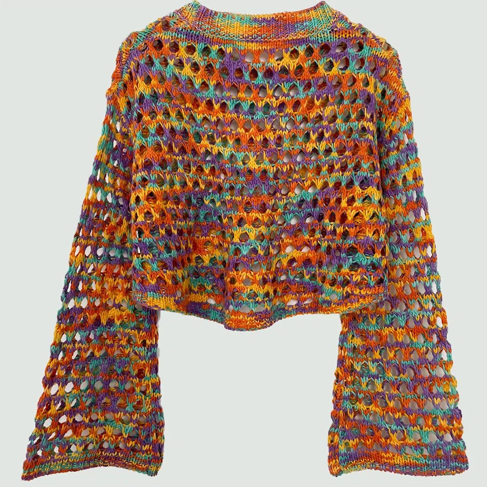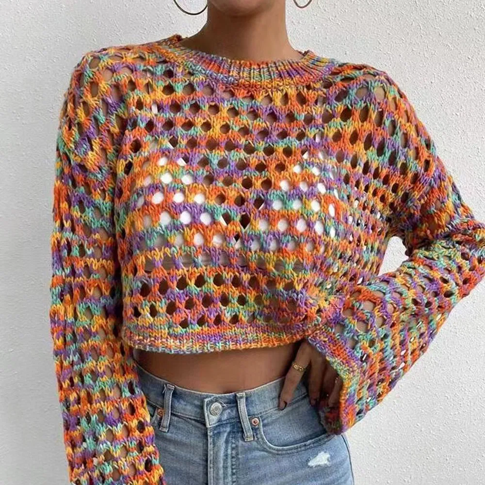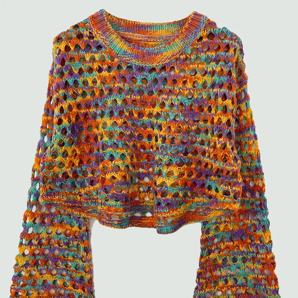 Crochet Crop Top Sweater Knitwear Women Hollow out Pullover Long Sleeve Sexy Boho Knitted Top Pink Custom