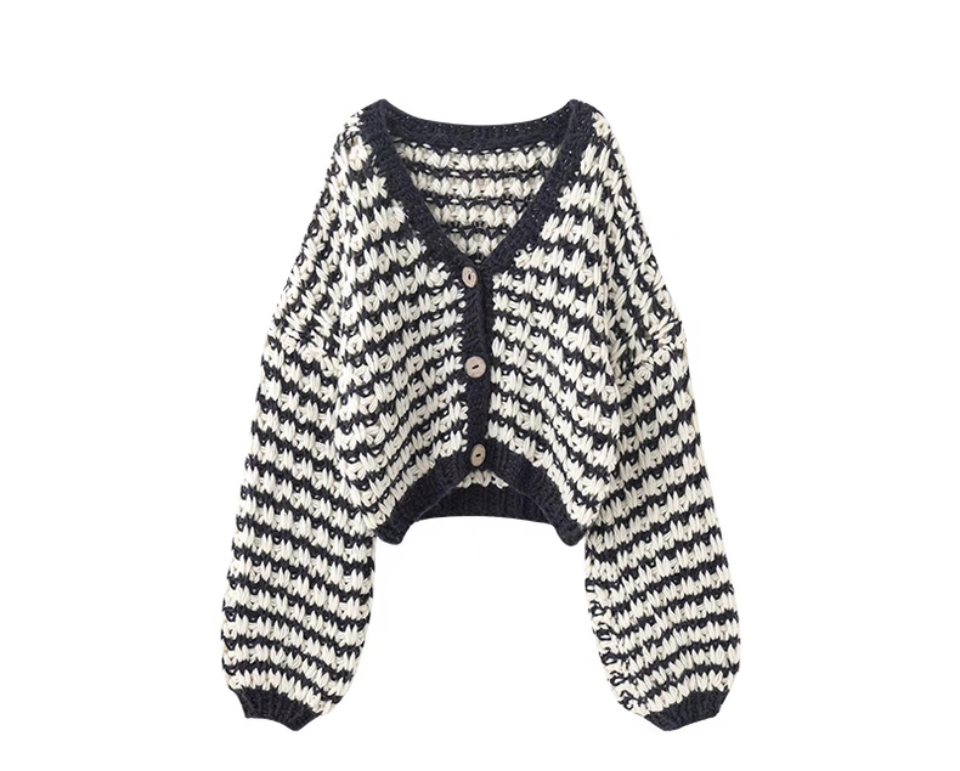 Fall Women′s Lantern Sleeve Cardigan Open Front Striped Knit