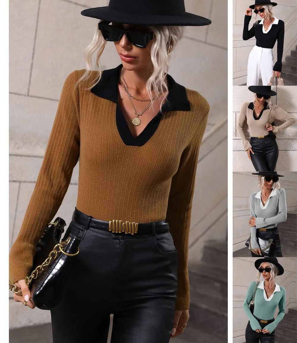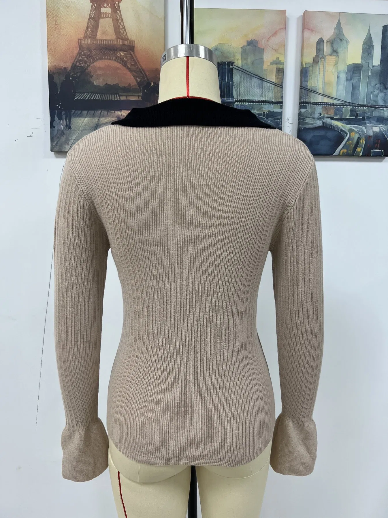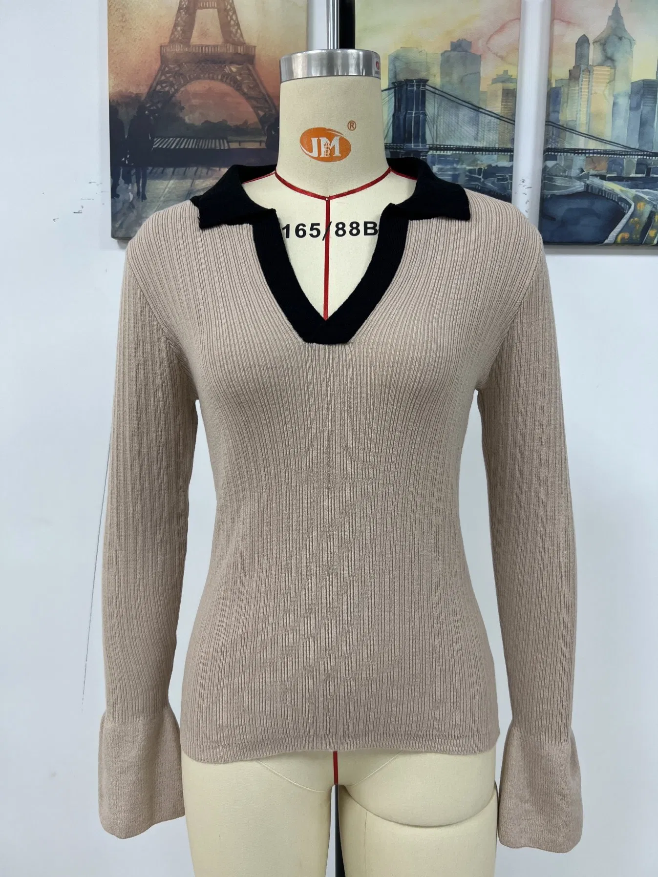 Autumn Winter Color Block Fashion Street Outfit Knitwear Clothing Polo V Neck Women New Flared Sleeve Lapel Pullover Sweater