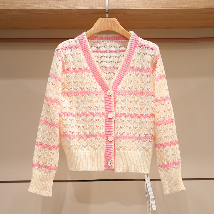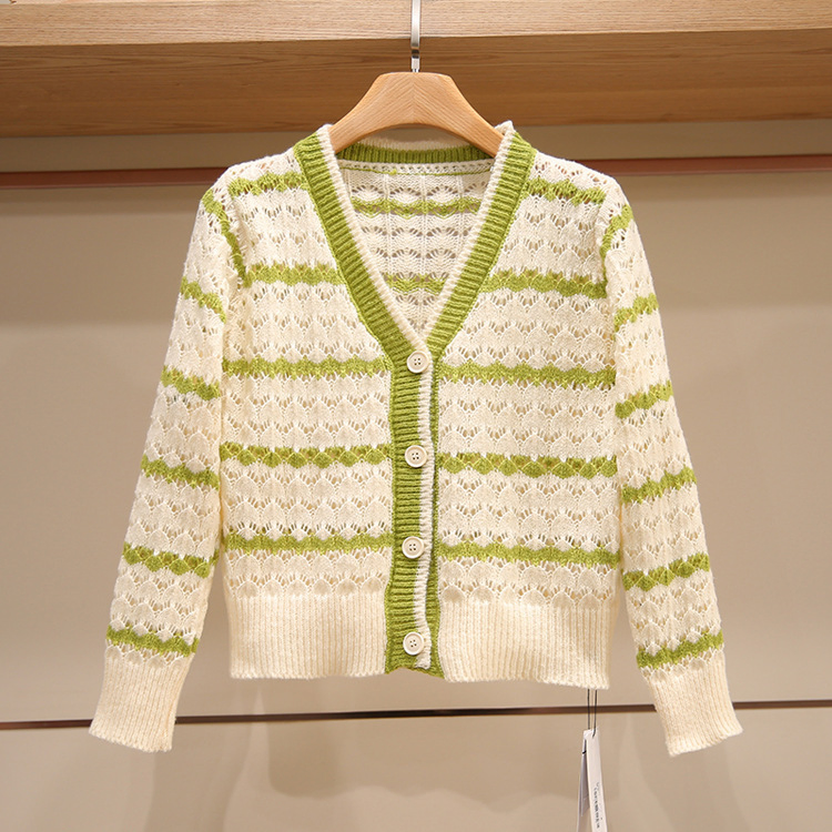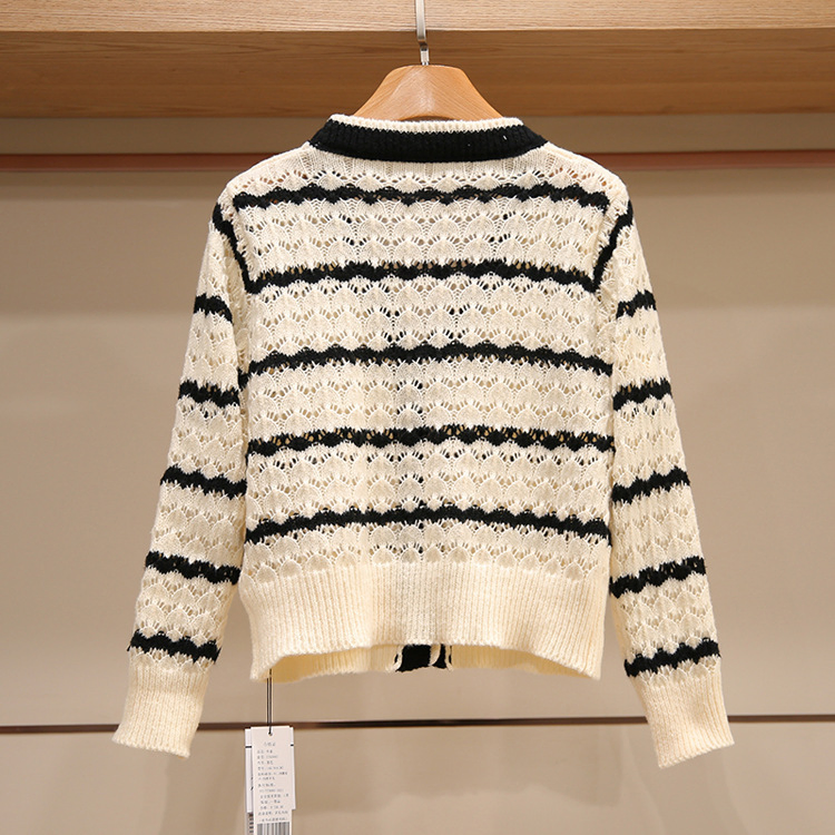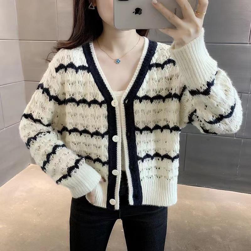 New 2024 Spring and Autumn Loose Outside with Striped Small Fragrance V-Neck Hollow Knit Cardigan Sweater Coat