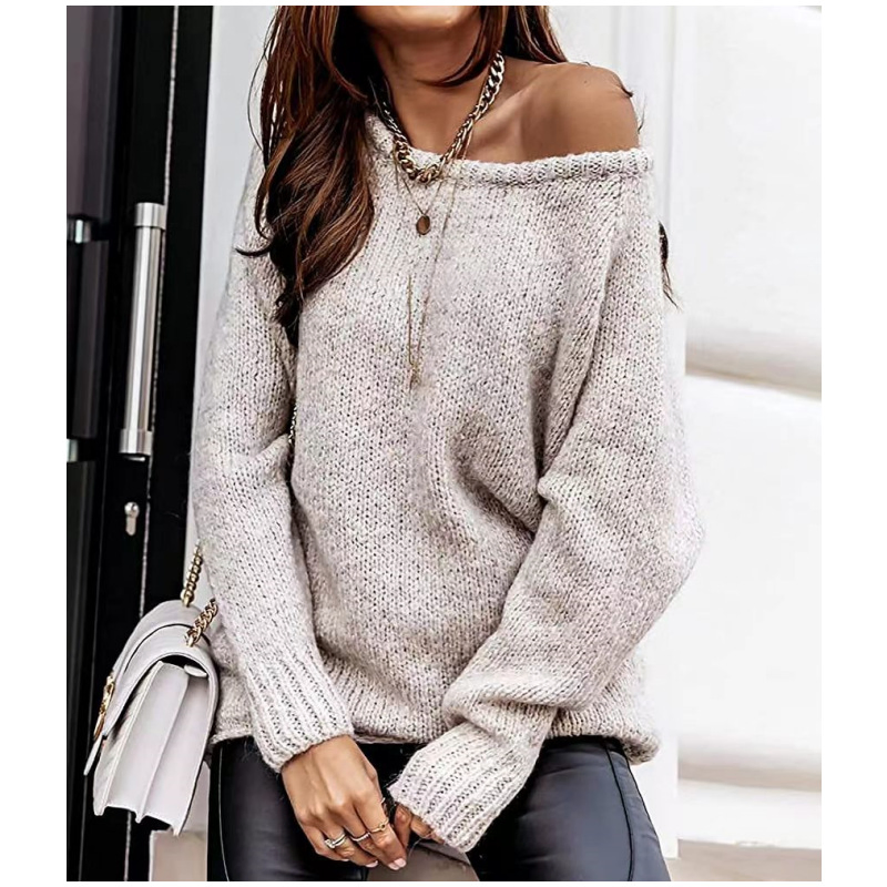 Autumn and Winter off Shoulder Sexy Round Neck Pullover Knit Solid Color Casual Loose Size Sweater for Women
