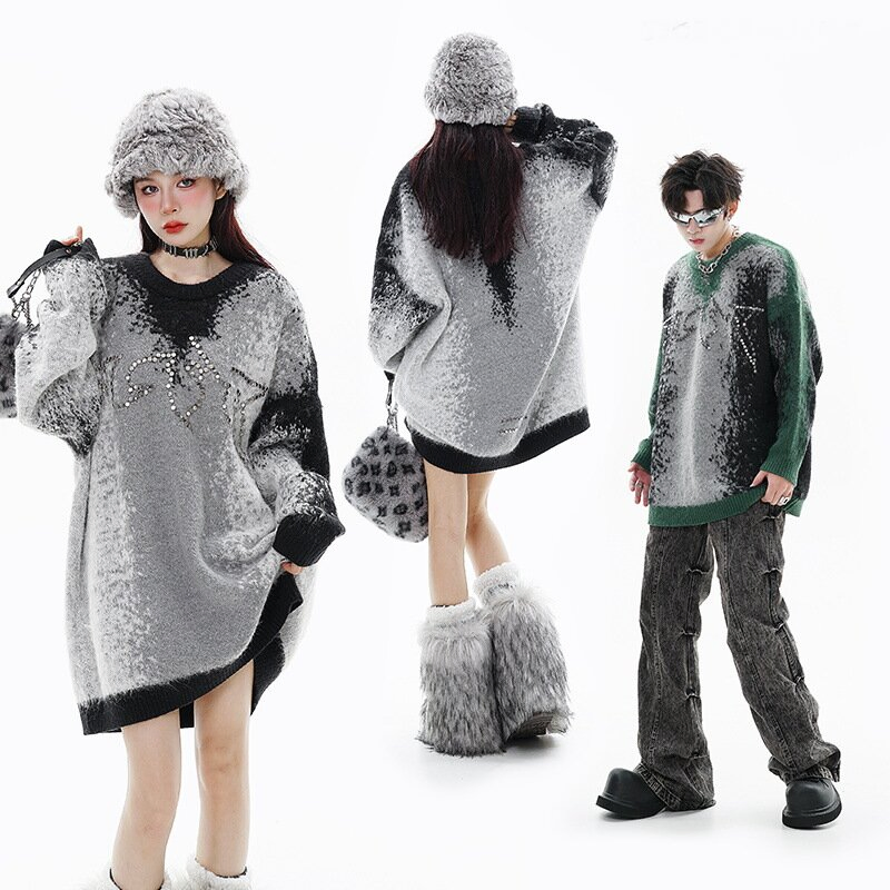 New Fashion Gradient Jacquard Metal Bead Contrast Sweater Round Neck Pullover Knit