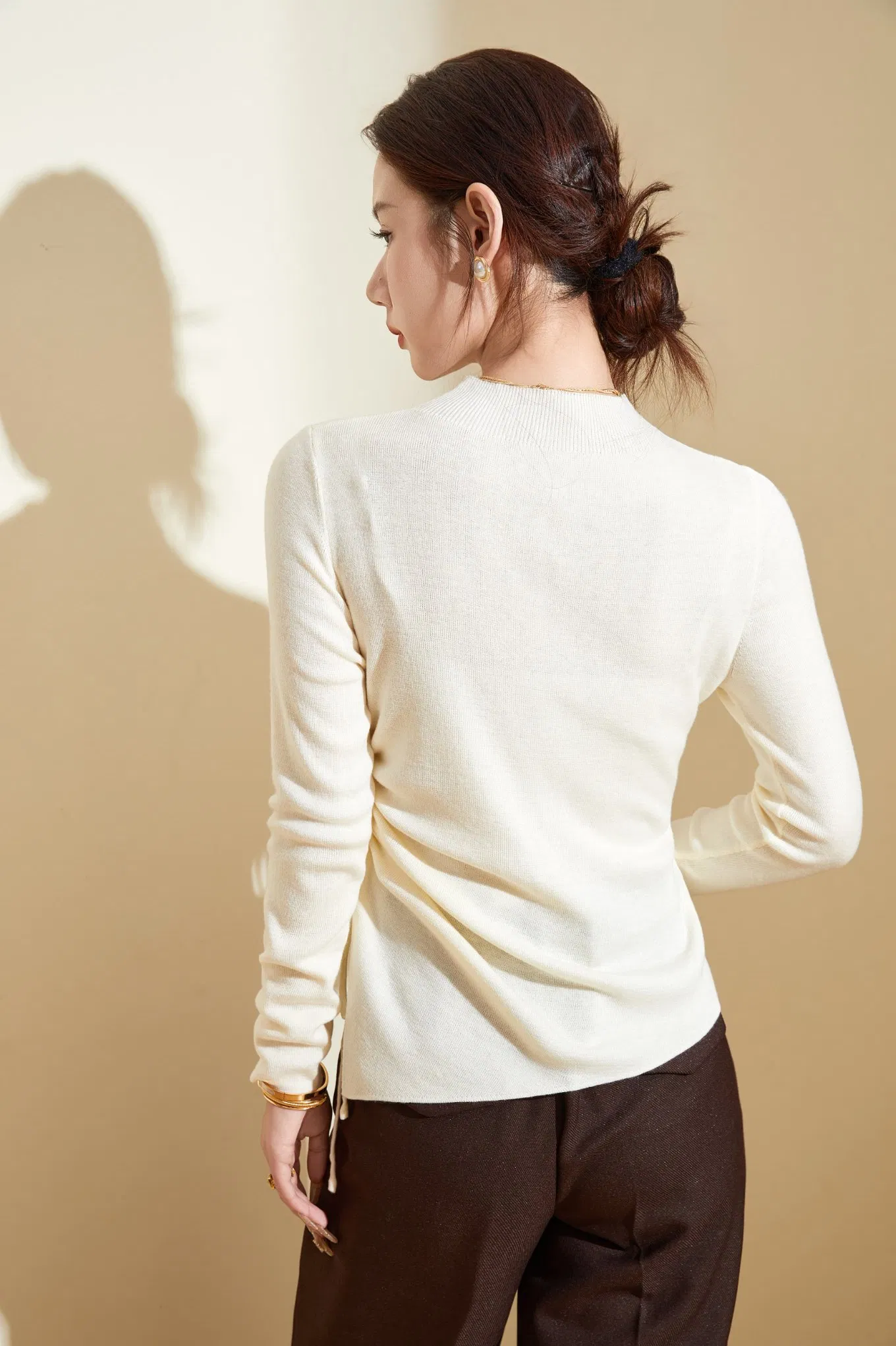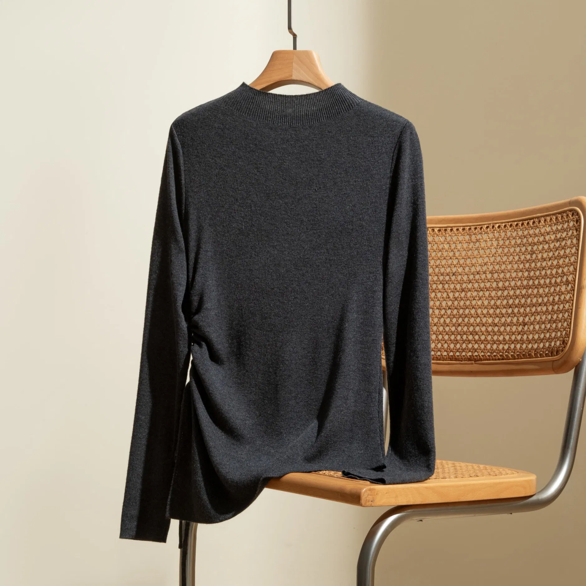 Luxury Women′s Side Drawstring Design 100% Wool Pullover Sweater