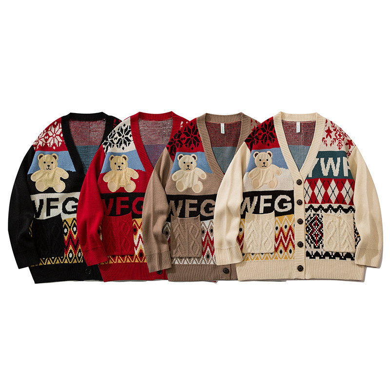 Unisex Retro American Style Cartoon Bear Knitted Cardigan Long-Sleeved V-Neck Sweater