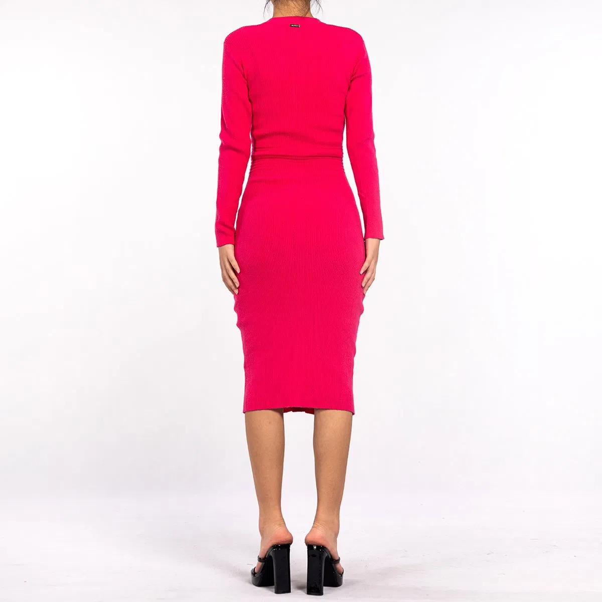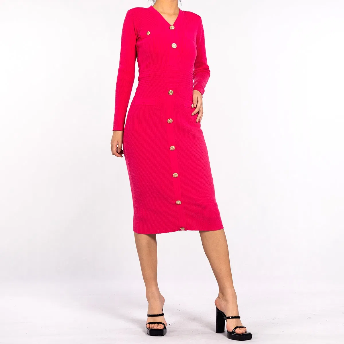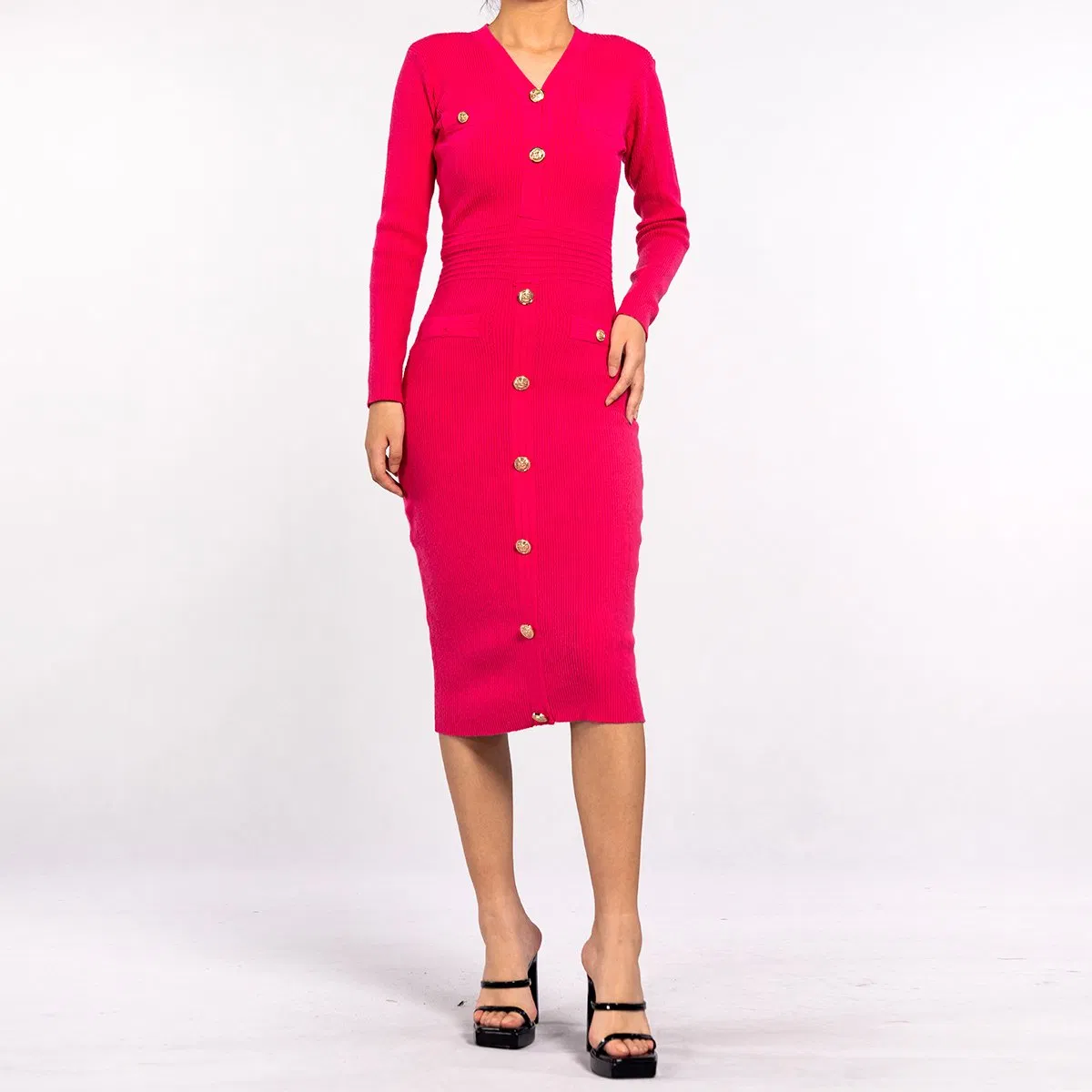Rose V-Neck Long Sleeve Tight Package Hip Sexy Ribbed Dresses for Women
