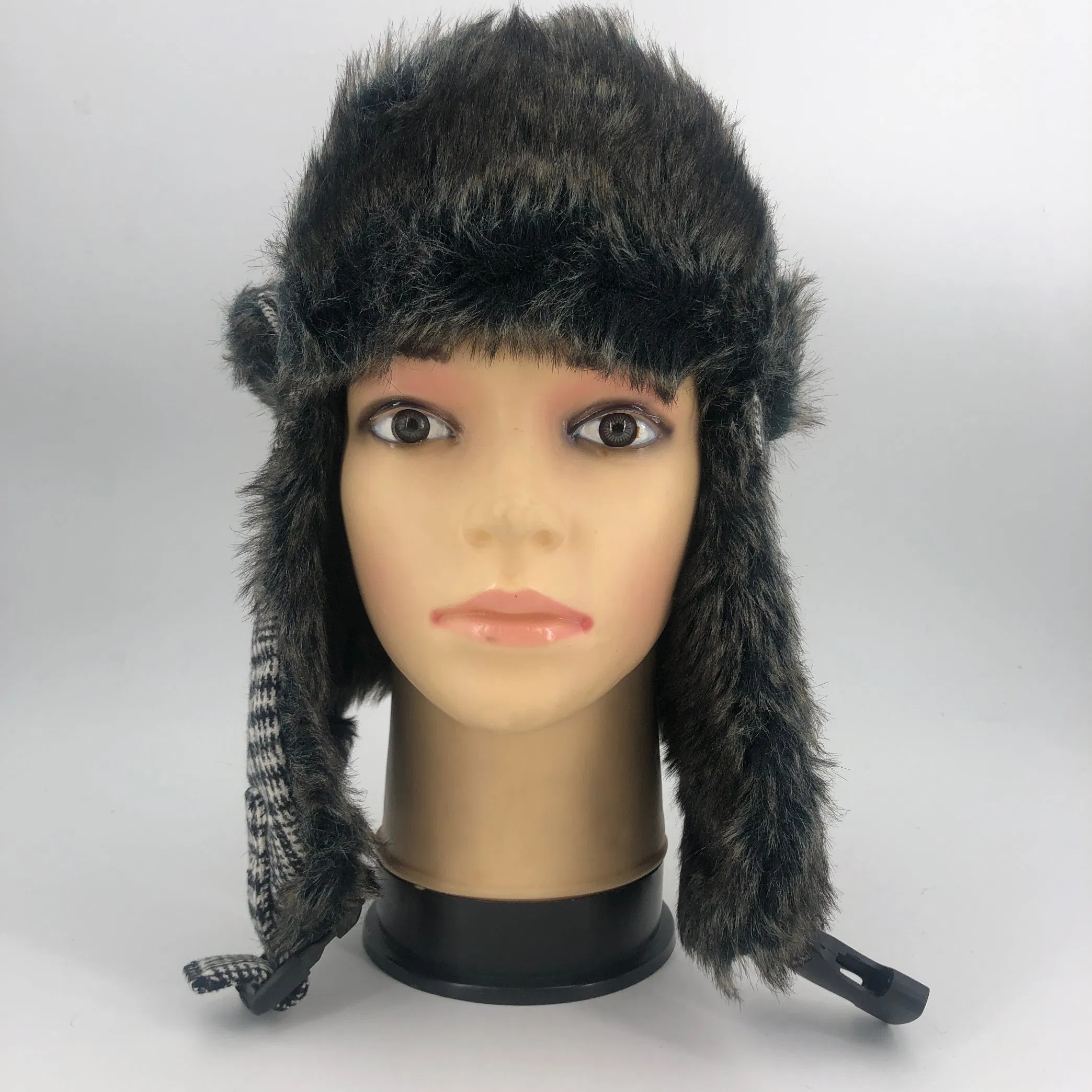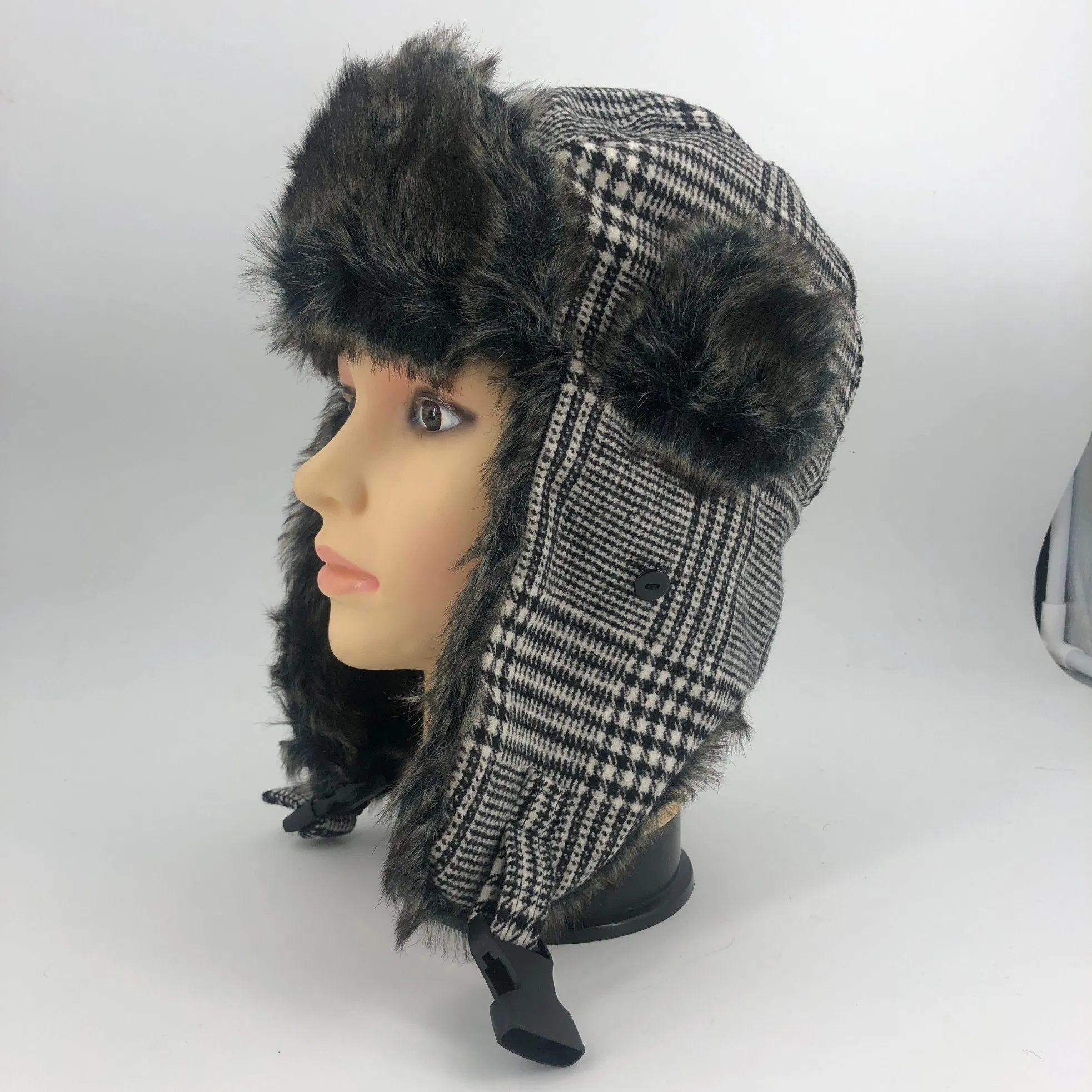 Unisex Soft Faux Fur Bomber Earflap Windproof Cap Winter Trooper Hat Classic Grid Stripe