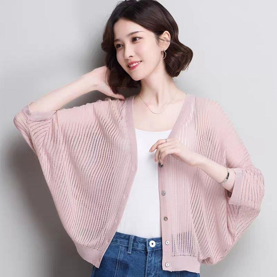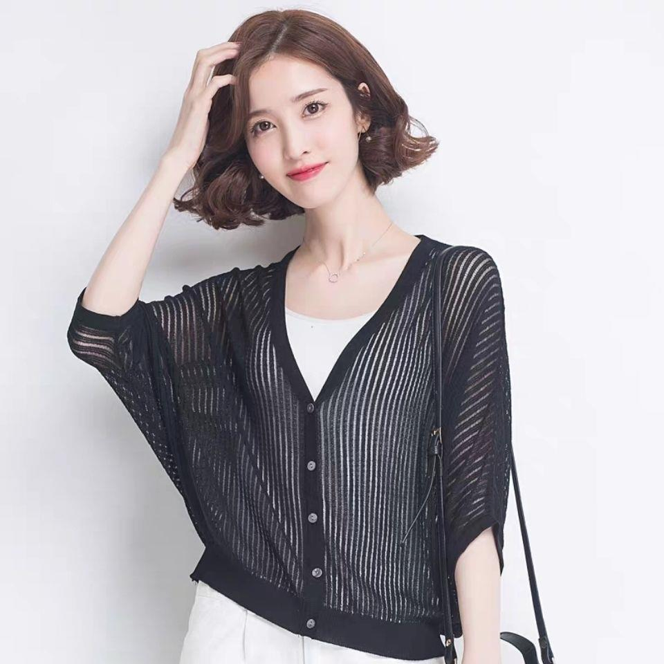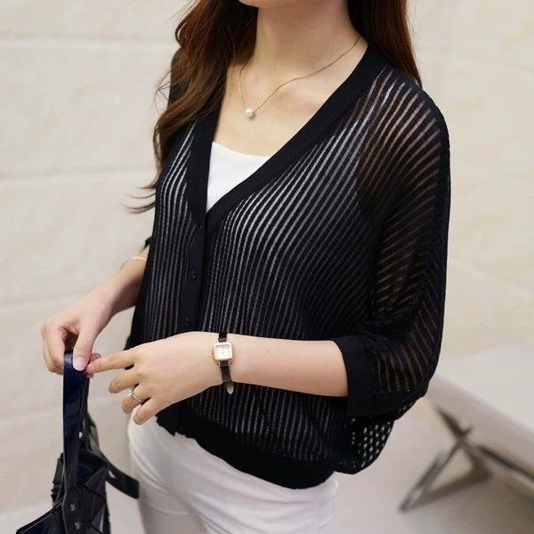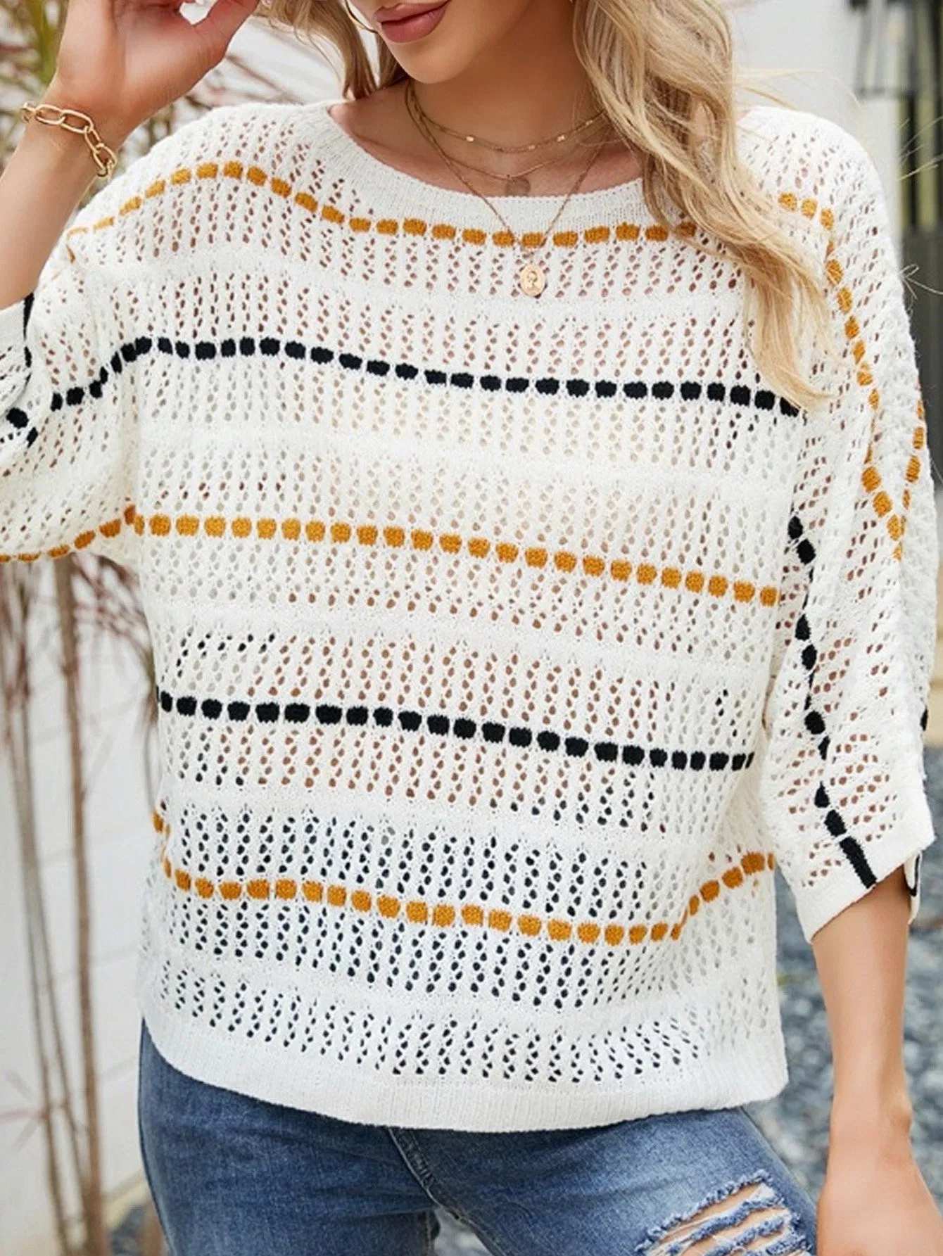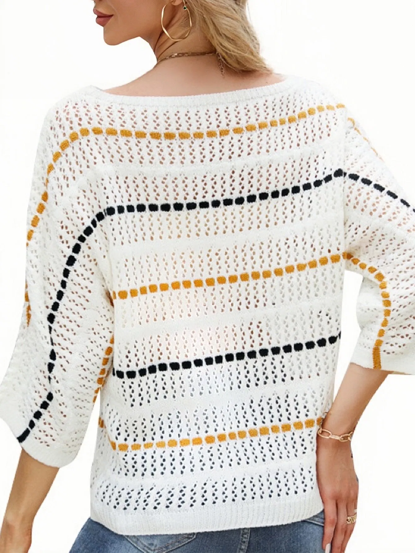 Suéter Holgado de Manga de Siete Puntos con Temperamento Superior para Mujer′ Suéter a Rayas con Delantal de Punto Ahuecado con Cuello de una Línea